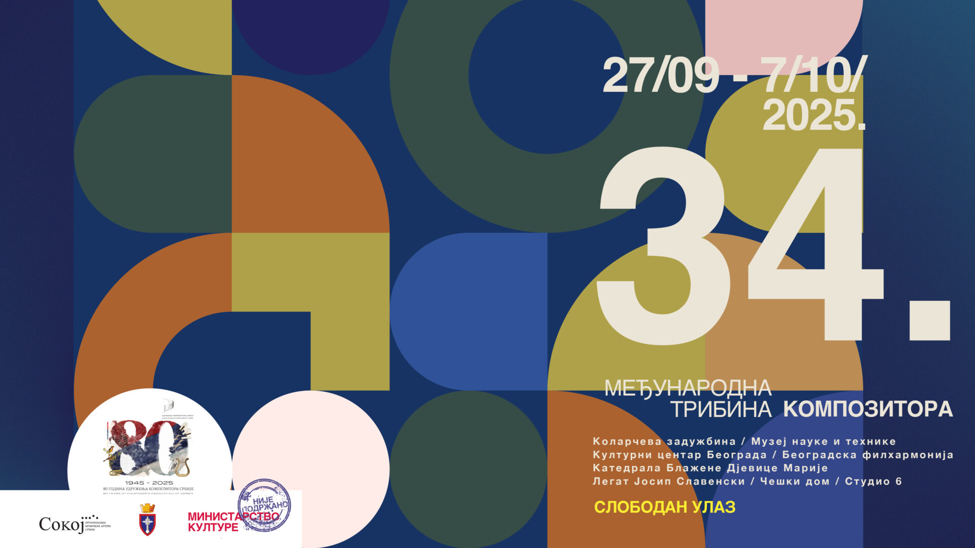 U godini kada Udruženje kompozitora Srbije proslavlja 80 godina Udruženja, program 34. Međunarodne tribine kompozitora obuhvata 13 koncerata i brojne prateće sadržaje, koji će biti realizovani od 27. septembra do 7. oktobra u više koncertnih prostora u Beogradu.