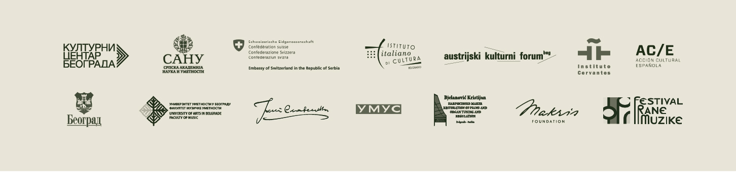 Grad Beograd, Italijanski institut za kulturu u Beogradu, Austrijski kulturni forum u Beogradu, Institut Servantes u Beogradu, Acción Cultural Española (AC/E), Ambasada Švajcarske u Beogradu, SANU, Muzička Škola Josip Slavenski, Fakultet muzičke umetnosti, Festival rane muzike, Kristijan Bjelanović – graditelj čembala