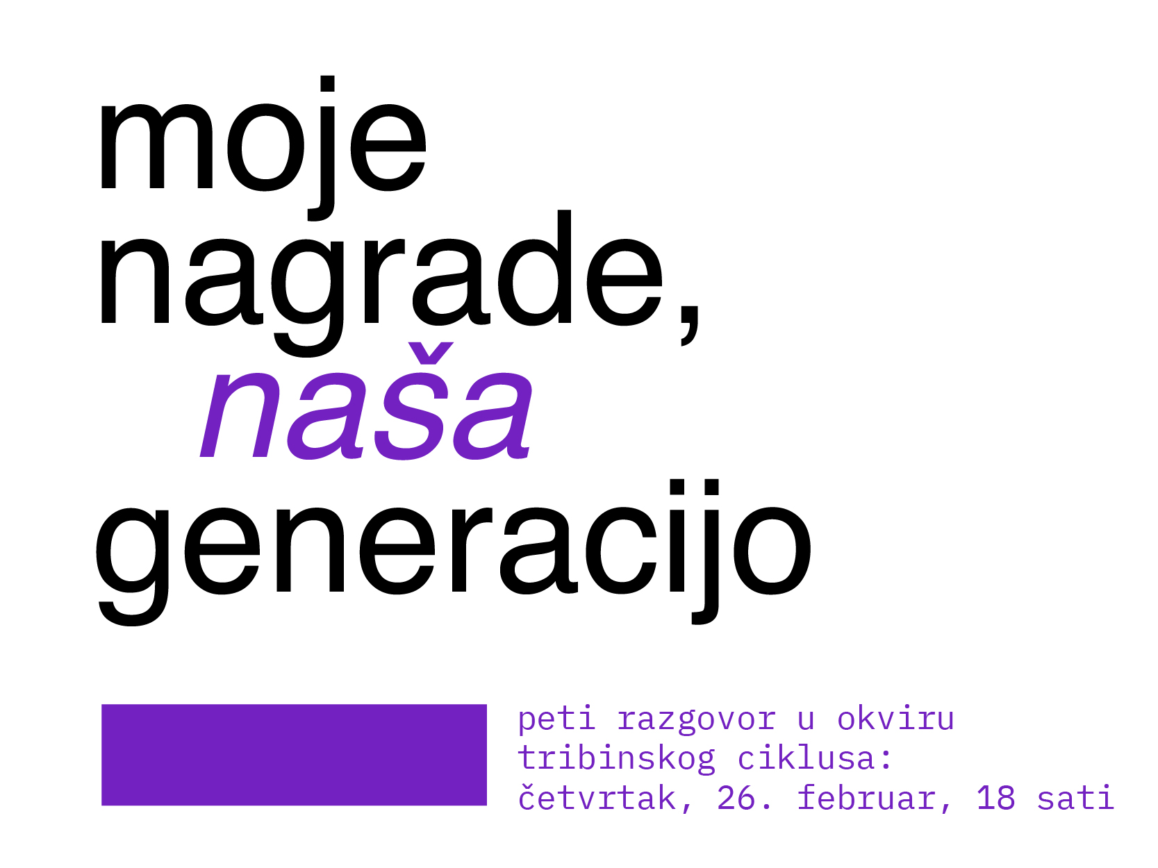 Moje nagrade, naša generacijo istovremeno je razgovor o nagradama i bez nagrada, o vidljivima i nevidljivima, o kanonima u nastajanju i onima koji se nikada neće formirati. Program se bavi revizijom institucija u književnosti – kroz analizu njihovog realnog dometa, ograničenja i simboličkog kapitala u savremenom kontekstu.