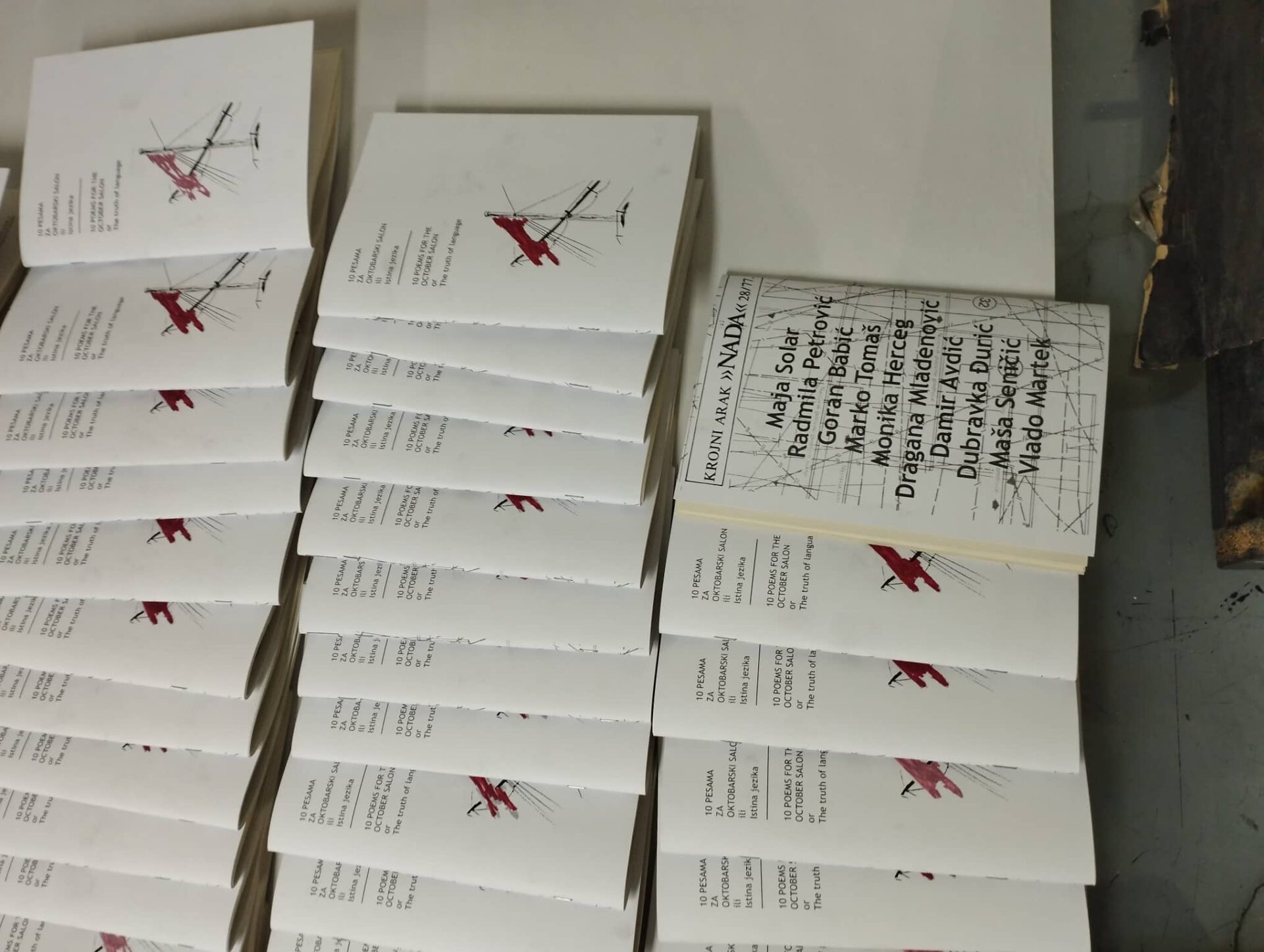 10 pesama za Oktobarski salon, 59. Oktobarski salon – programski eksperiment u okviru kojeg su Damir Avdić, Goran Babić, Dubravka Đurić, Monika Herceg, Vlada Martek, Dragana Mladenović, Radmila Petrović, Maša Seničić, Maja Solar i Marka Tomaš odgovarali svojim pesmama na pitanje: „Da li je prešućivanje laganje?“ Ovo pitanje, koje može biti jedno od krucijalnih za svaki odnos, za svaku mikro- ili makro-zajednicu, posebno u aktuelnom trenutku, citat je iz dela Marije Grazio, takođe učesnice 59. Oktobarskog salona. U široj verziji citat glasi: „Nos je narast’o veliki, a ja se trudila iz petnih žila govorit istinu. Je li prešućivanje laganje?“ (Urednice zbirke: Zorana Đaković Minniti i Olivera Stošić Rakić)
