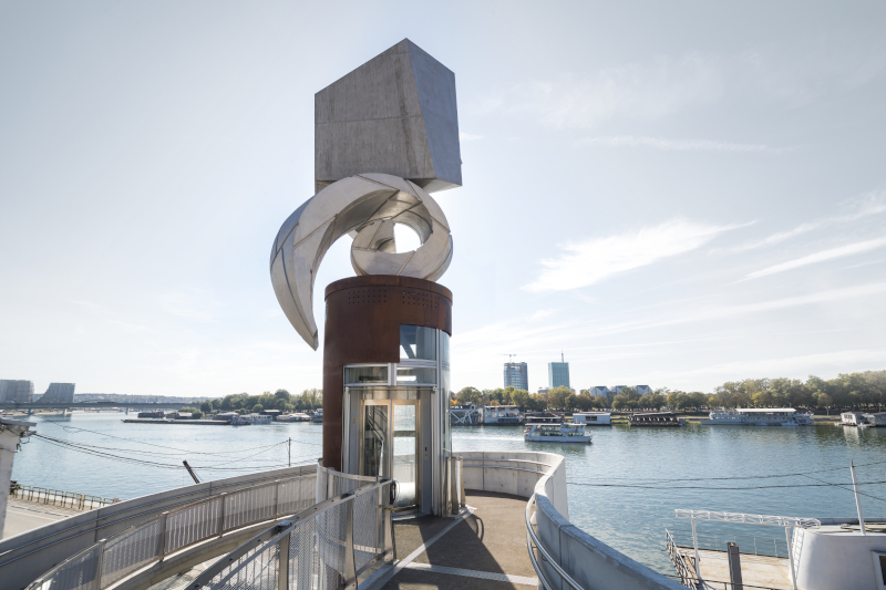 …Arhitekti su iskoristili visinsku razliku od nekoliko metara između površine vode i izgrađene obale i tu sakrili objekat, postavljajući ga na pontone tako da prati horizontalu reke i ni na koji način ne remeti prepoznatljivu panoramu Beograda. Platforma pluta u nivou donje brodske palube, tako da sa obale ništa ne smeta pogledu na brodove privezane paralelno u nekoliko redova prema sredini reke.